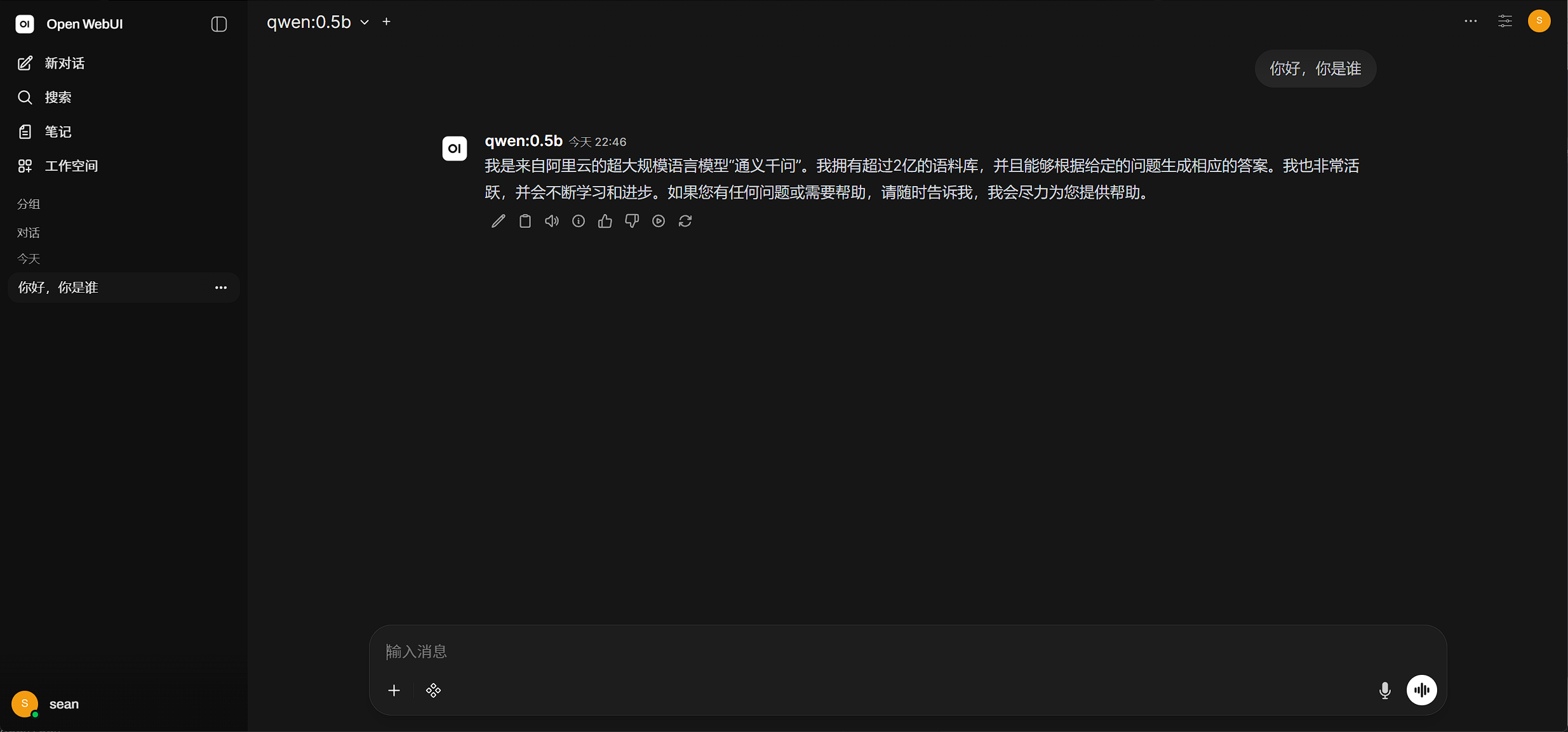 登录后,点击界面中的“模型”选项,就能看到我们刚才下载的 Qwen 0.5B 模型,选择模型后,就可以开始聊天交互了,和使用 ChatGPT 等工具的体验完全一致。